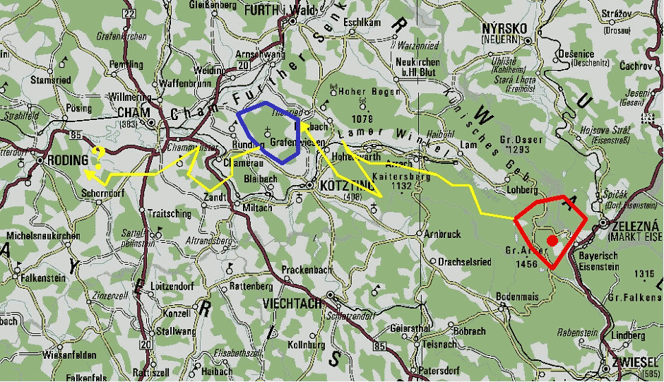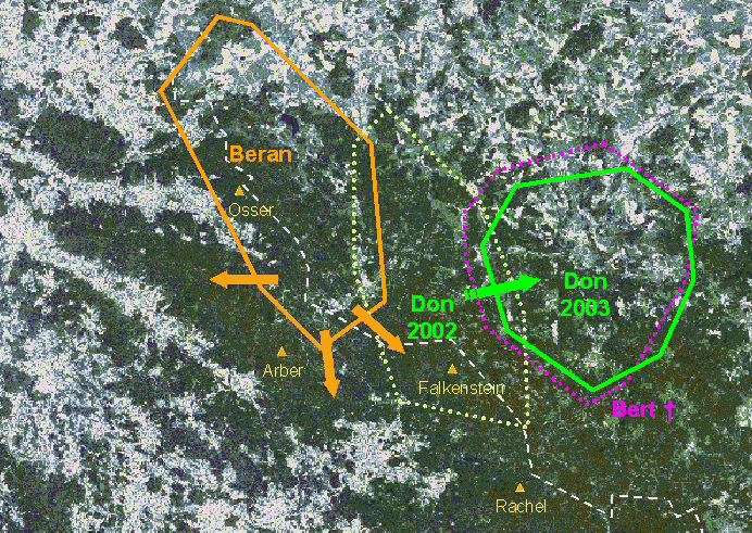 Beide hatten große Reviere – Berans Revier umfasste fast 400 km² – und waren vermutlich Nachbarn. Im angrenzenden Böhmen schloss sich das Revier des Kuders Bert an, der im Frühjahr 2001 von tschechischen Kollegen besendert wurde.