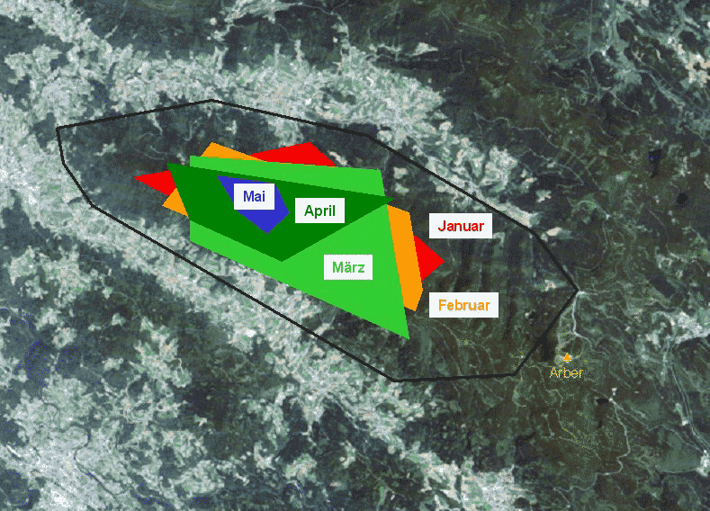 Im Jahr 2002 änderte Andra ihr Verhalten deutlich im Vergleich zum Vorjahr. Während sie 2001 ihr Revier das ganze Jahr über recht gleichmäßig nutzte und dabei auch weite Ausflüge nach Tschechien unternahm, zeigte sich 2002 ein anderes Muster. Von Januar bis Mai konzentrierte sich ihre Aktivität zunehmend auf ein immer kleineres Gebiet.