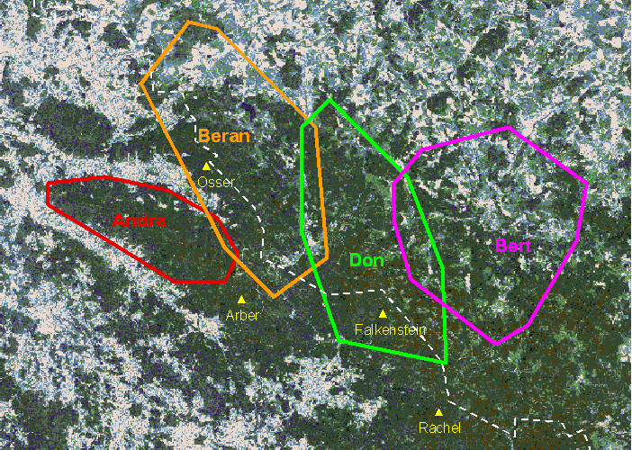 In den Jahren 2001 und 2002 konzentrierte sich die telemetrische Forschung auf vier erwachsene Luchse im Grenzgebiet. Das Weibchen Andra war zum Zeitpunkt ihres Fangs Ende 2000 wohl noch nicht territorial. Im Jahr 2001 unternahm sie häufig Ausflüge nach Nordosten, die sie bis weit nach Tschechien führten. 2002 hingegen blieb sie standorttreu und bewegte sich hauptsächlich zwischen Großem Arber und Kötzting. Hinweise deuten darauf hin, dass in Andras Gebiet ein weiteres Tier, vermutlich ein Kuder, unterwegs war.