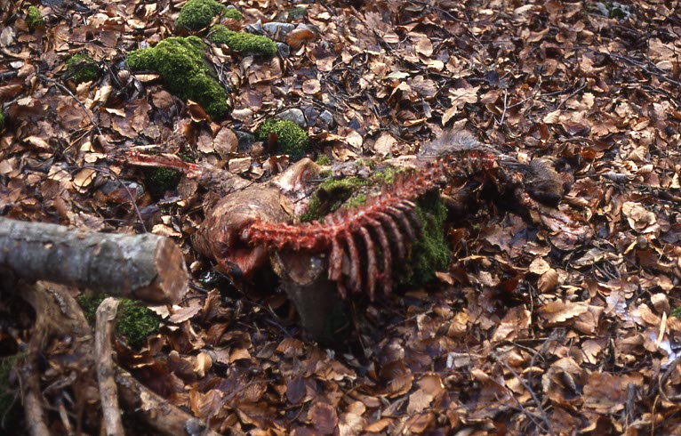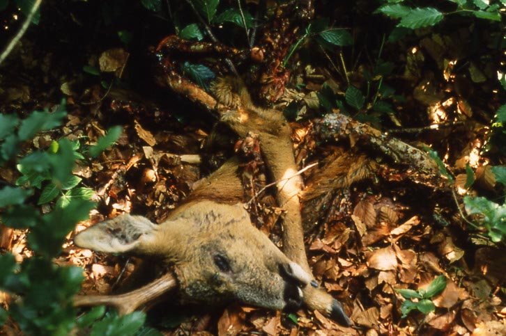 Oft trennt der Fuchs Körperteile von großen Beutetieren ab, wie hier den Kopf des Rehs. Der Luchs macht dies nicht, er zieht im Bedarfsfall die ganze Beute in Deckung.